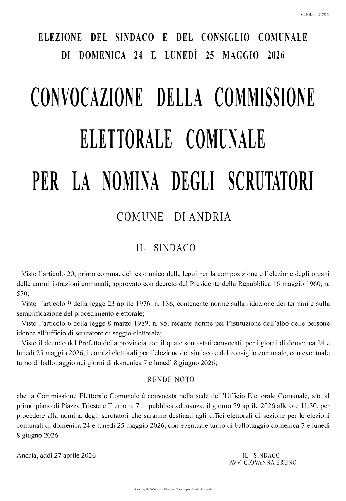Per l'elezione del Sindaco e del Consiglio Comunale per il Comune di Andria, il Sindaco rende noto che la Commissione Elettorale Comunale è convocata nella sede dell'Ufficio Elettorale Comunale, sita al primo piano di Piazza Trieste e Trento n. 7 in pubblica adunanza, il giorno 29 aprile 2026 alle ore 11:30, per procedere tramite sorteggio alla nomina degli scrutatori che saranno destinati agli uffici elettorali di sezione per le elezioni comunali di domenica 24 e lunedì 25 maggio 2026, con eventuale turno di ballottaggio domenica 7 e lunedì 8 giugno 2026.