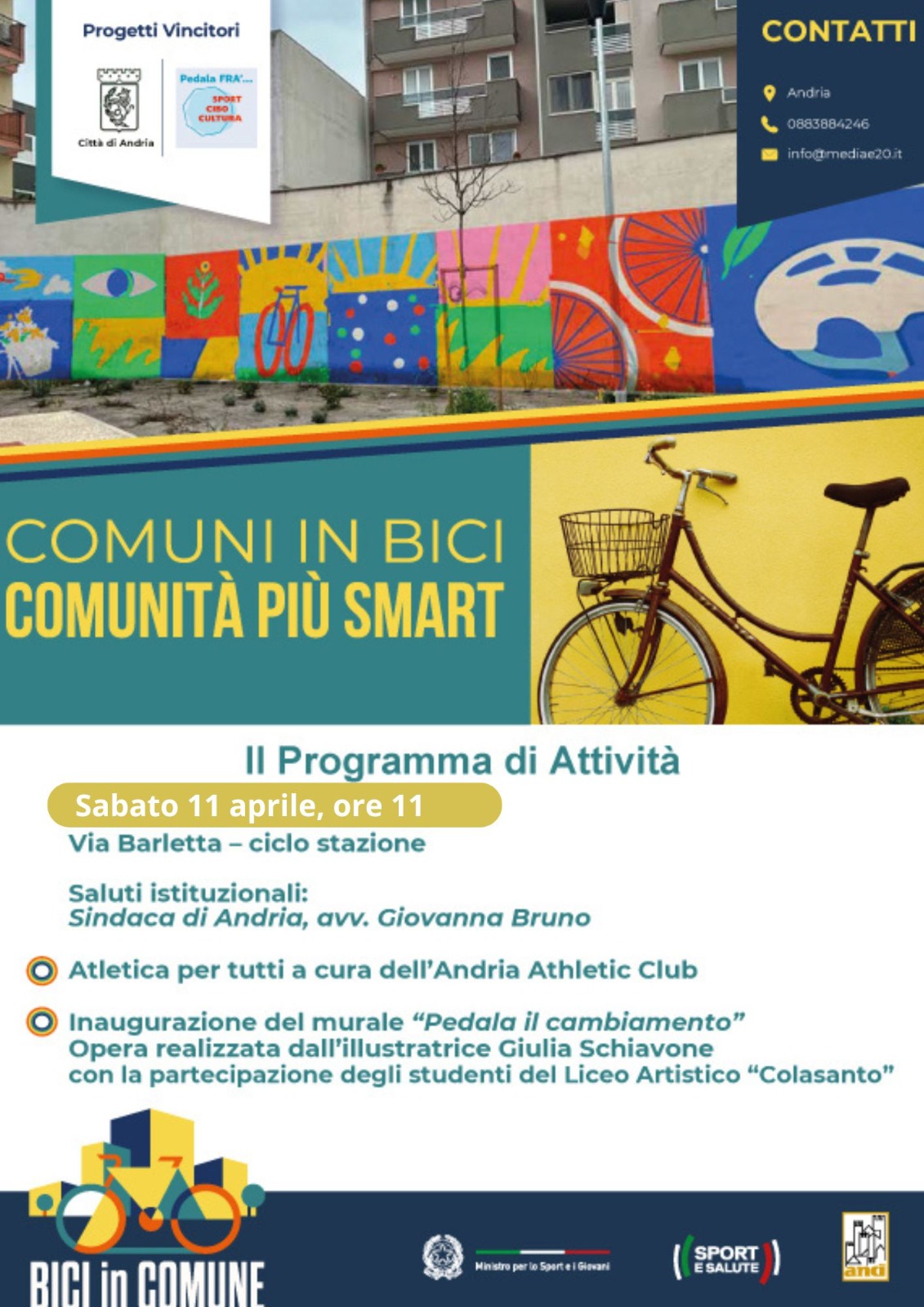 Si parte venerdì 27 marzo con la consegna ufficiale del murale realizzato nei pressi della casa cantoniera di via Barletta. L’opera, firmata dall’illustratrice Giulia Schiavone con la collaborazione degli studenti del liceo artistico Colasanto, porterà colore e vitalità, in un tratto interessato dalla rigenerazione urbana, con lo slogan “Pedala il cambiamento”, simbolo di energia, positività e partecipazione attiva. A partire dalle ore 16.00, la piazzetta antistante ospiterà anche le lezioni di atletica curate dall’associazione Andria Athletic Club, con l’obiettivo di promuovere l’attività fisica e i corretti stili di vita. L’invito è aperto alla cittadinanza che potrà raggiungere in bicicletta la velostazione di via Barletta.