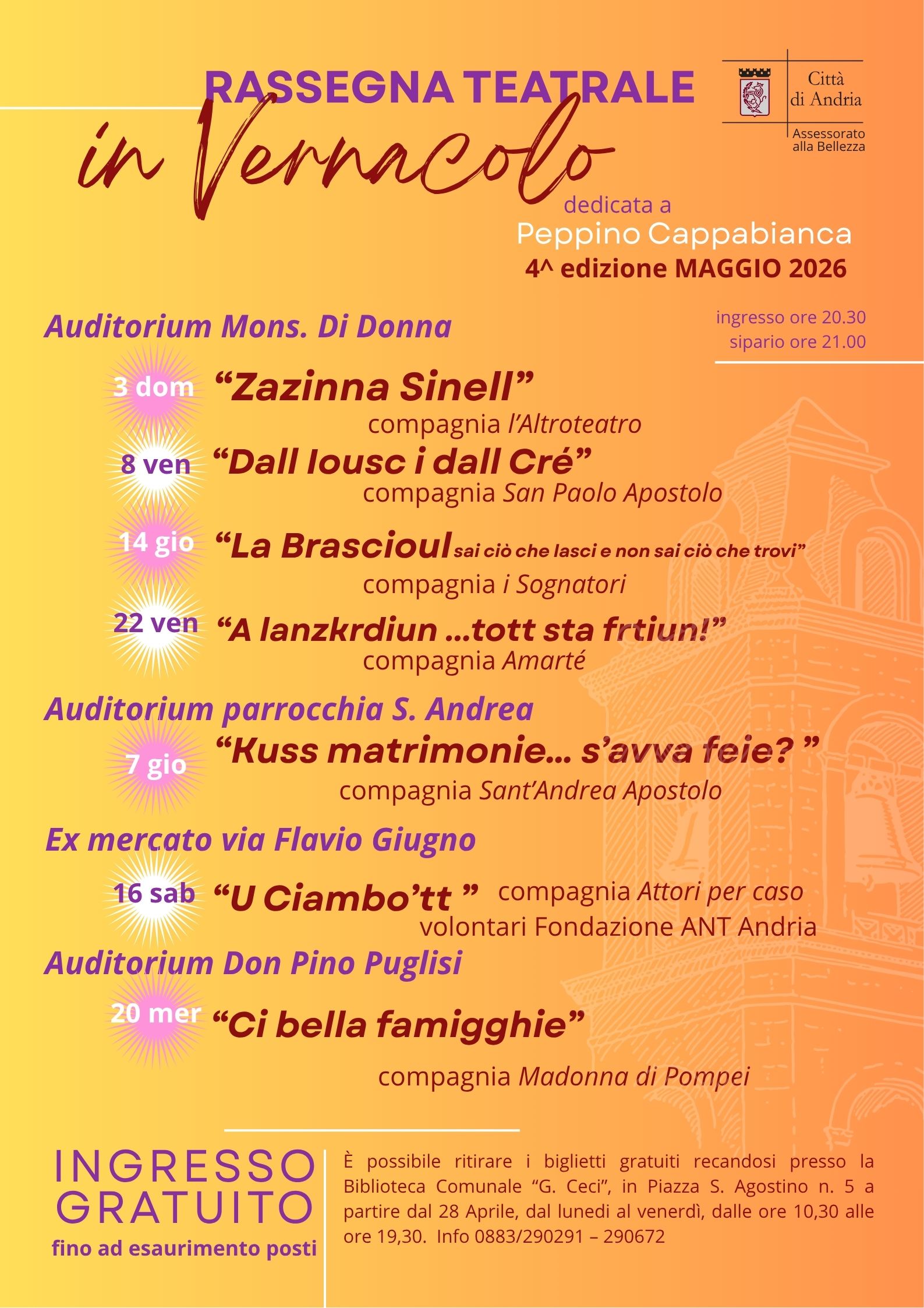 Istituita stabilmente con Deliberazione di Giunta Comunale n. 45 del 23 marzo 2023, la rassegna rappresenta uno degli appuntamenti più significativi per la promozione del dialetto andriese quale espressione autentica dell’identità cittadina, strumento fondamentale per la tutela e lo sviluppo delle tradizioni, nonché per il rafforzamento del senso di appartenenza alla comunità. Con Deliberazione di Giunta Comunale n. 40 del 10 marzo 2026, l’edizione di quest’anno è dedicata alla figura di Peppino Cappabianca, protagonista della scena teatrale locale e appassionato cultore del dialetto sin dalla giovinezza.
