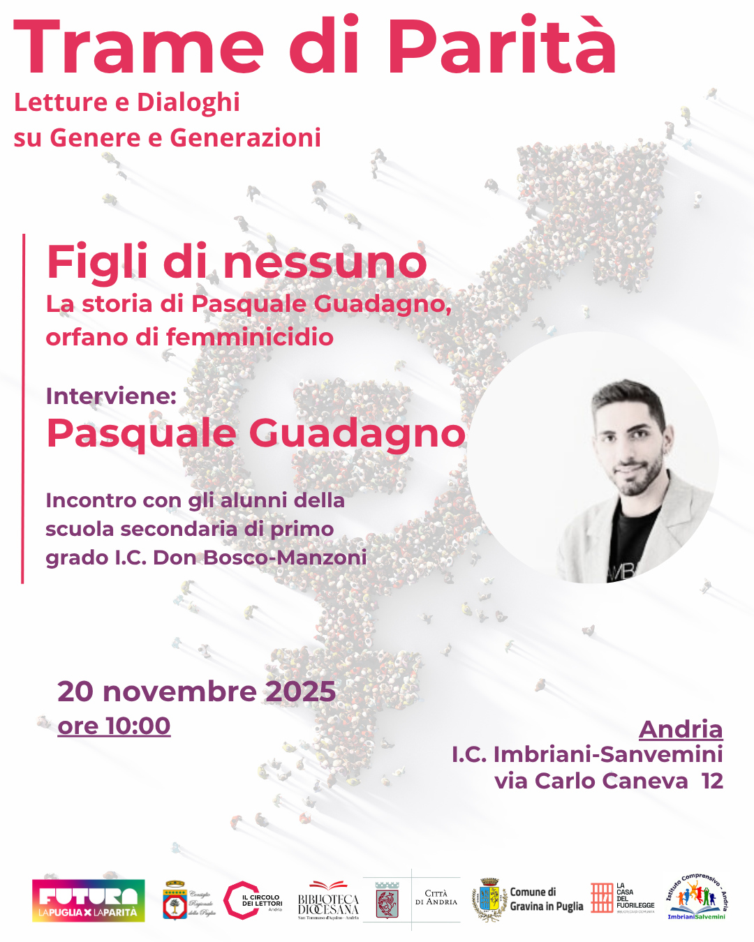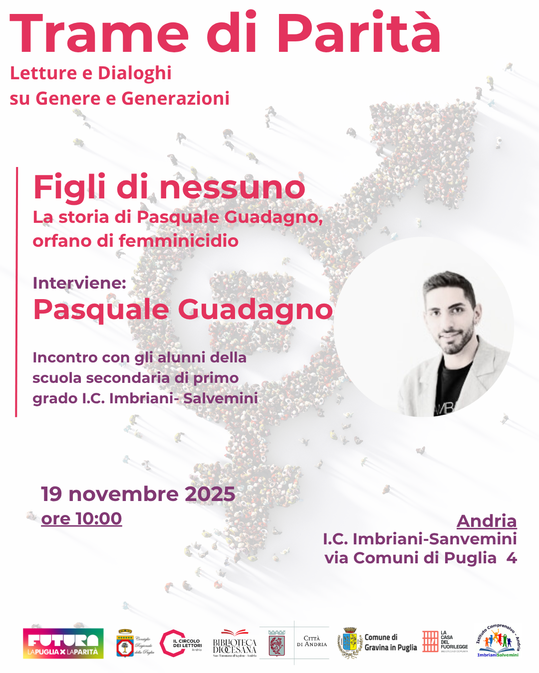 Un racconto necessario, potente, che nasce dal dolore e si trasforma in voce, impegno, testimonianza. Il prossimo appuntamento di Trame di Parità – Letture e Dialoghi su Genere e Generazioni vedrà protagonista Pasquale Guadagno, autore del libro e del progetto “Figli di nessuno”, dedicato a chi, come lui, ha perso la madre per femminicidio.